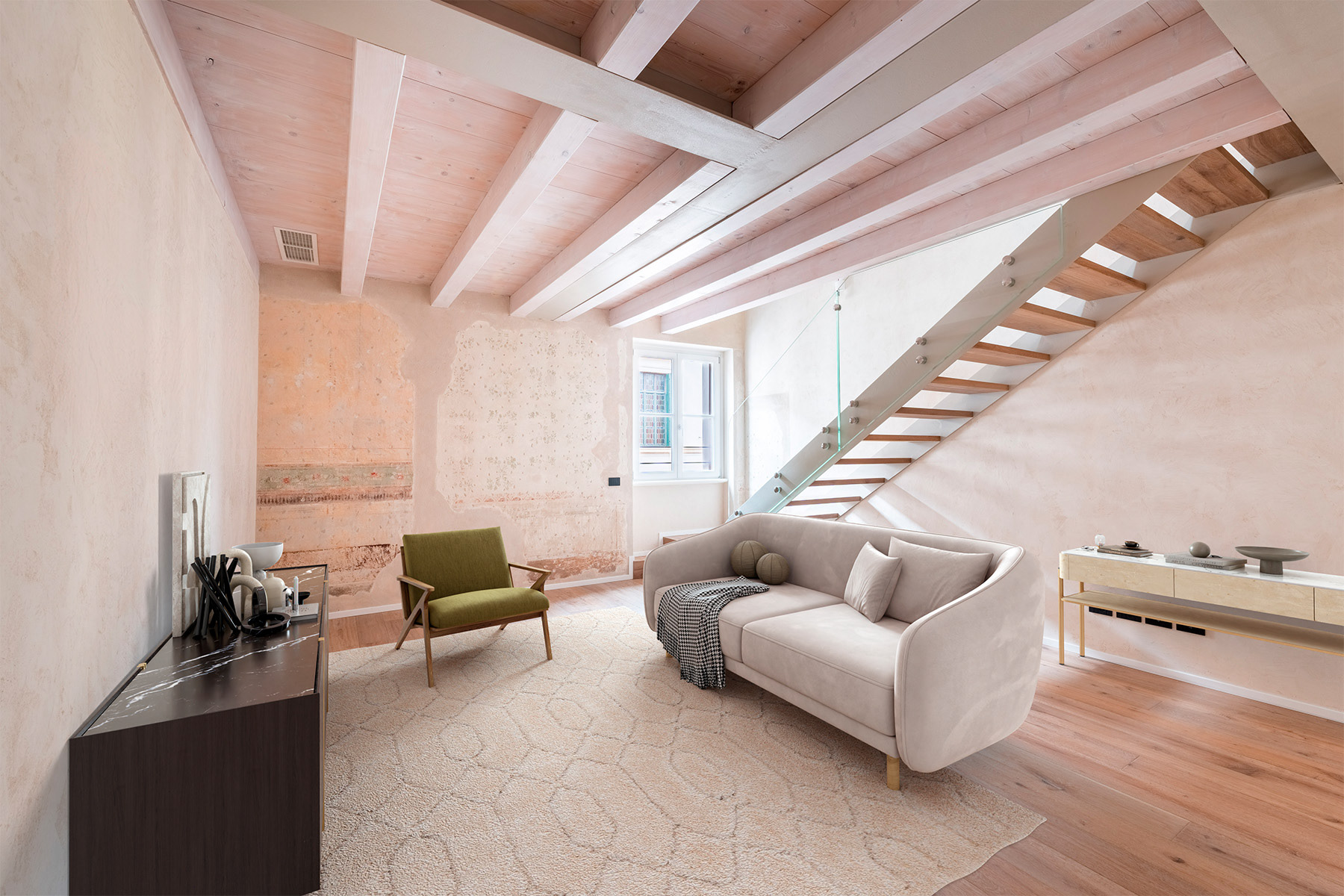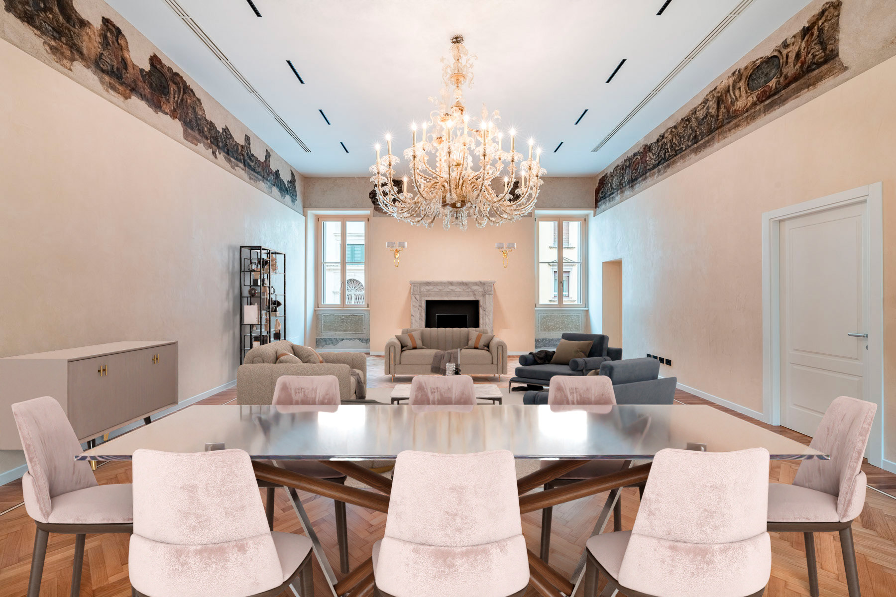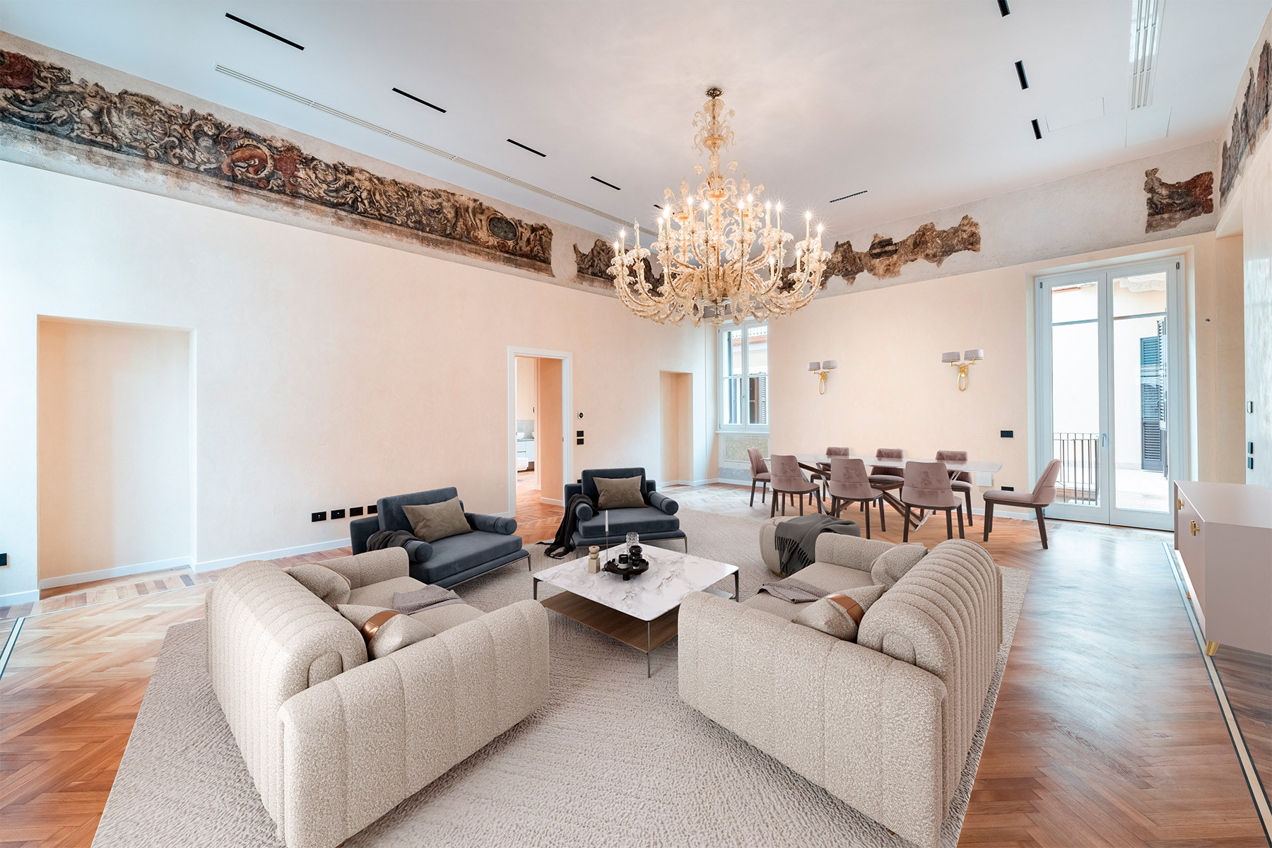 Palazzo Gaspari - A Masterpiece of Restoration and Elegance The restoration of Palazzo Gaspari, a 17th-century building in Verona, has transformed this historic landmark into a prestigious residential complex. 9 apartments have been restored, with a focus on maintaining a strong identity with past and the present. The piano nobile apartment features original frescoes, a grand marble staircase, and Slavonian oak flooring, all meticulously restored. A Murano glass chandelier and modern LED lighting accentuate the historic charm, while state-of-the-art systems ensure contemporary comfort. High-end natural materials, refined finishes, and exceptional craftsmanship throughout create a seamless fusion of heritage and luxury in this unique residence, just steps from Verona’s iconic landmarks.