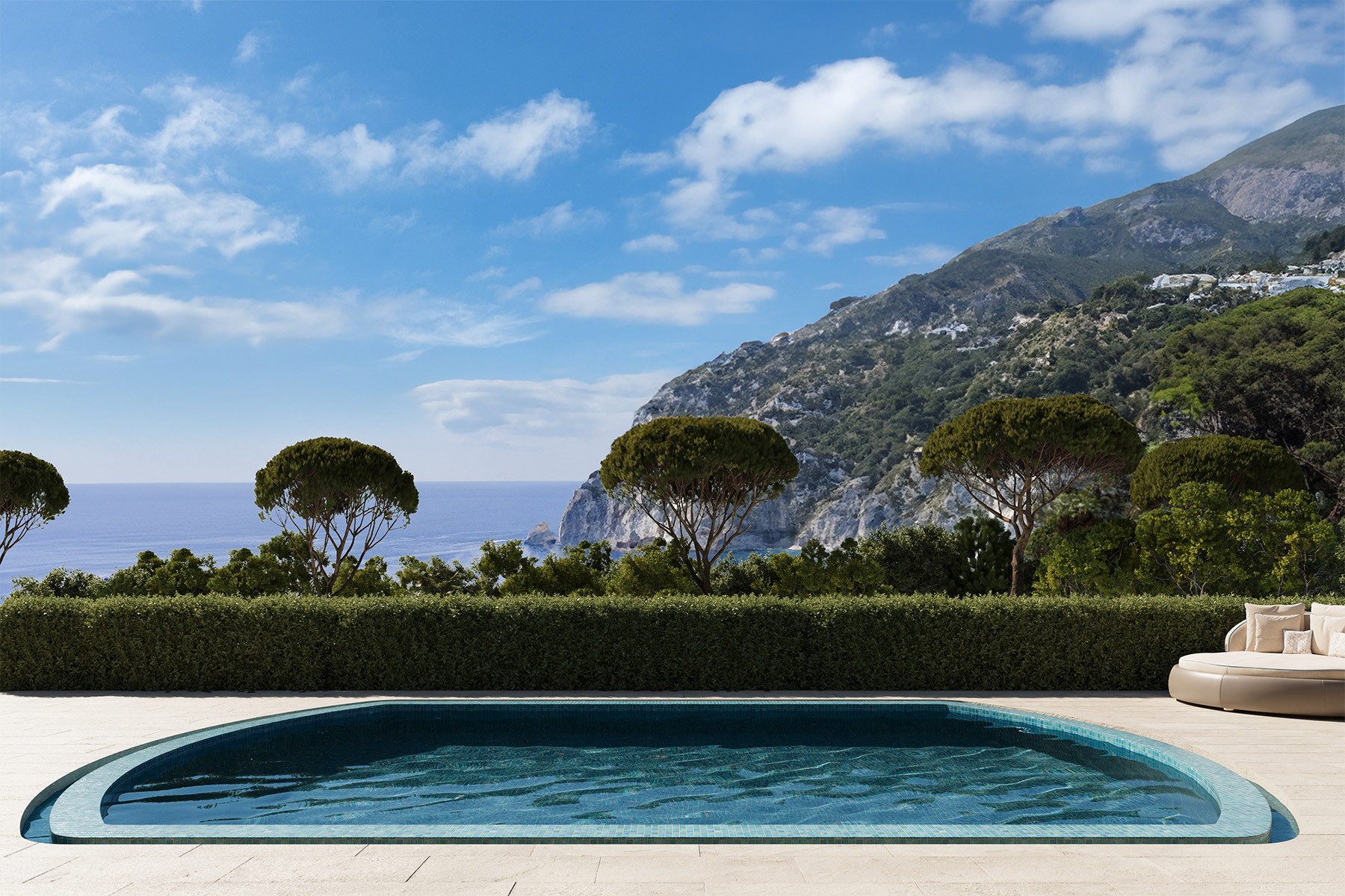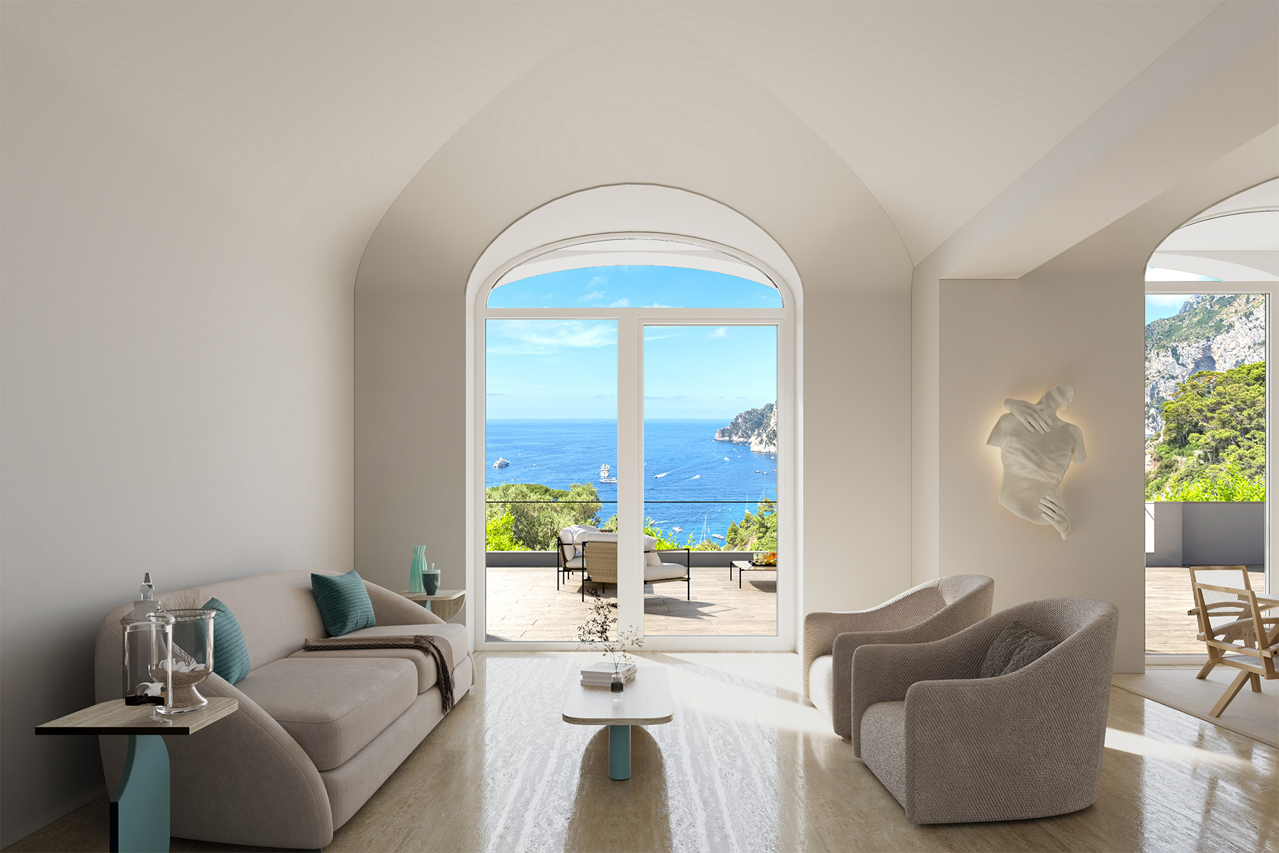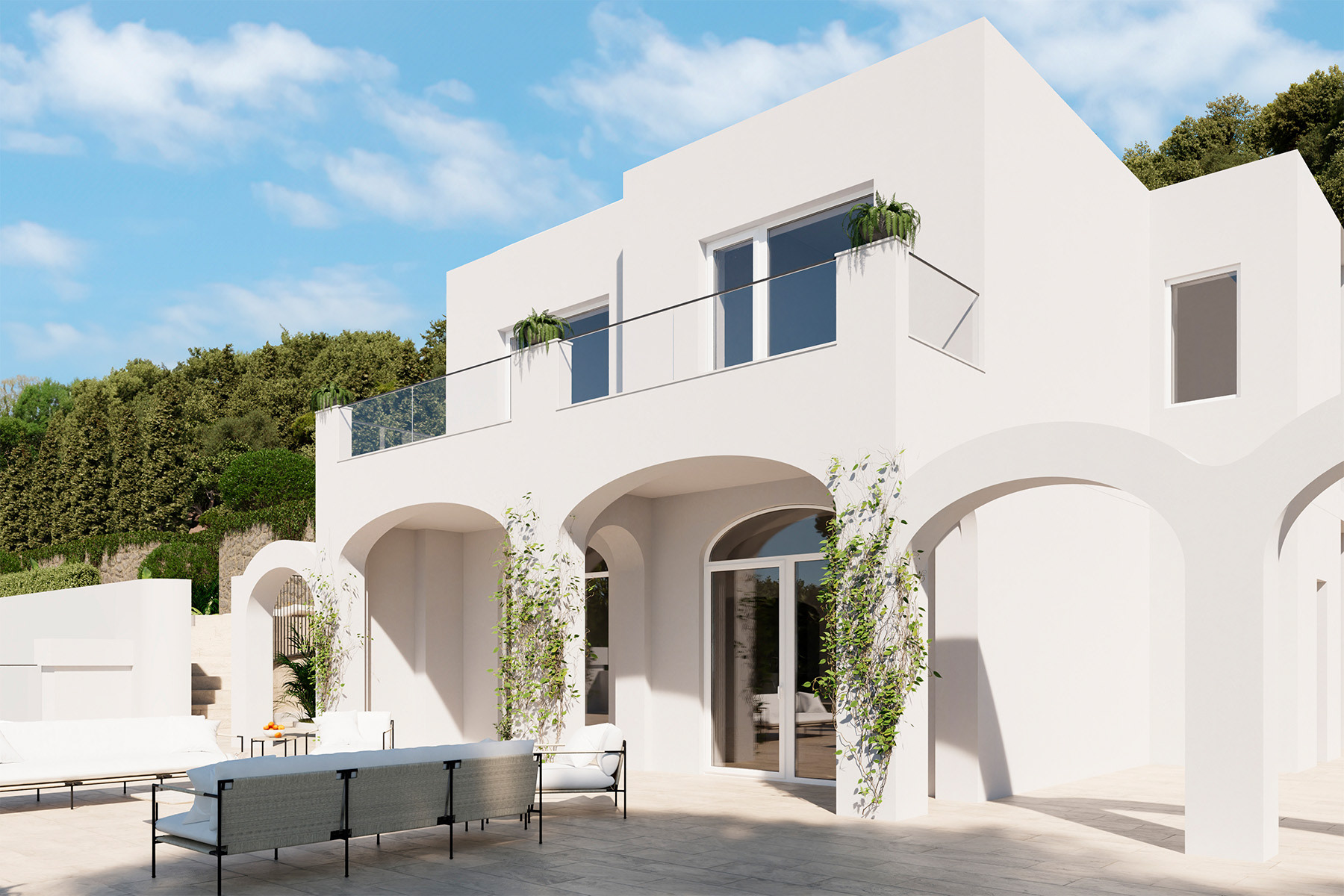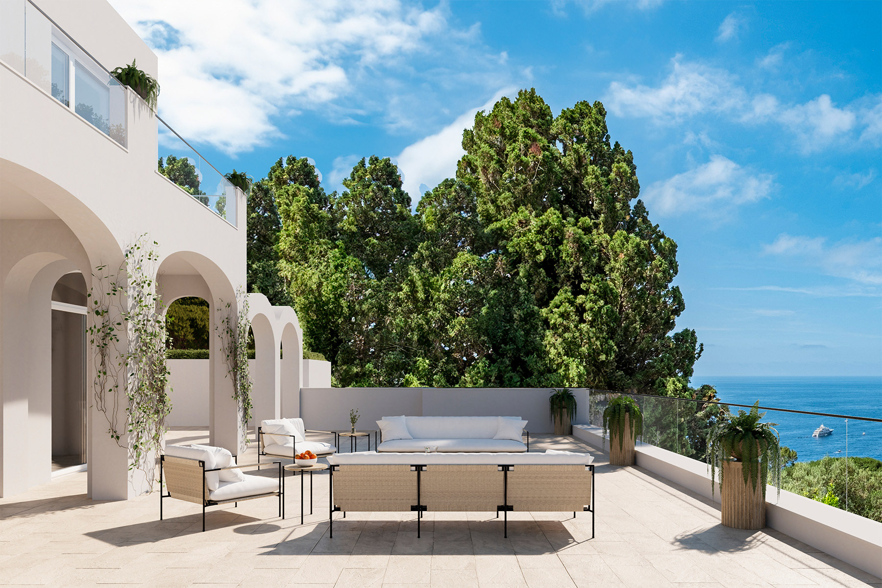 This enchanting villa in Capri embodies classic Mediterranean style with its elegant white stucco exterior and inviting porch. The expansive terrace offers breathtaking views of the sparkling sea, creating an ideal setting for outdoor dining and relaxation. Surrounded by lush gardens, the property provides a tranquil oasis where nature and luxury coexist harmoniously. This villa captures the essence of coastal living, making it a perfect retreat for those seeking the beauty and charm of Capri.